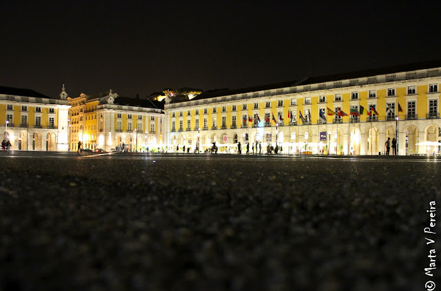 Deve ser uma praça maravilhosa, tal é a amplitude. Assim de noite e do ângulo em que foi tirada a foto, parece-me que vem do chão. Sabe o que dá vontade de fazer... sentar no chão, dobrar os joelhos, cruzar as pernas e deixar o tempo passar. Lisboa é linda demais.